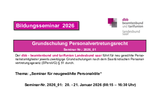 Der dbb - beamtenbund und tarifunion Landesbund saar führt ein Bildungsseminar mit dem Thema „Seniorenpolitik“ durch. Es findet statt vom 25. bis 26. August 2025.